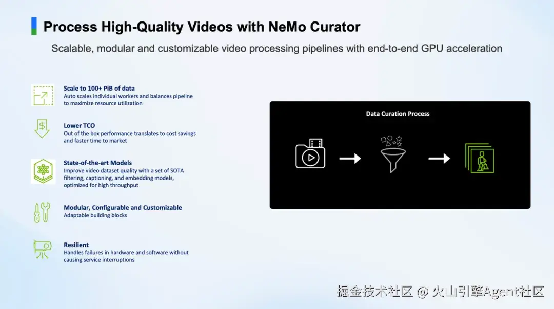 NeMo Curator 还可以进行高质量的视频数据处理、加工工作。目前在我们的实践过程中最高使用到了 100 PB 的数据处理。此外可以进一步降低 TCO 的使用成本、可以结合 SOTA 模型、可以模块化配置进行客户客制化。