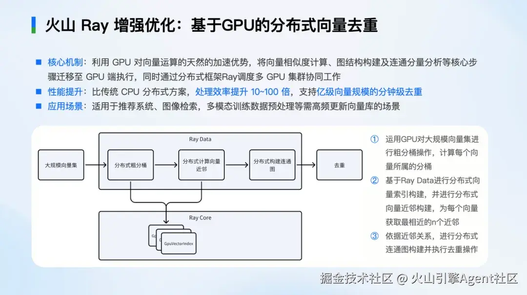 基于 GPU 的分布式向量去重工作,其核心在于充分利用 GPU 对向量运算的天然的加速优势,尤其在向量相似度计算、图结构构建及连通分量分析等,有较好效果。