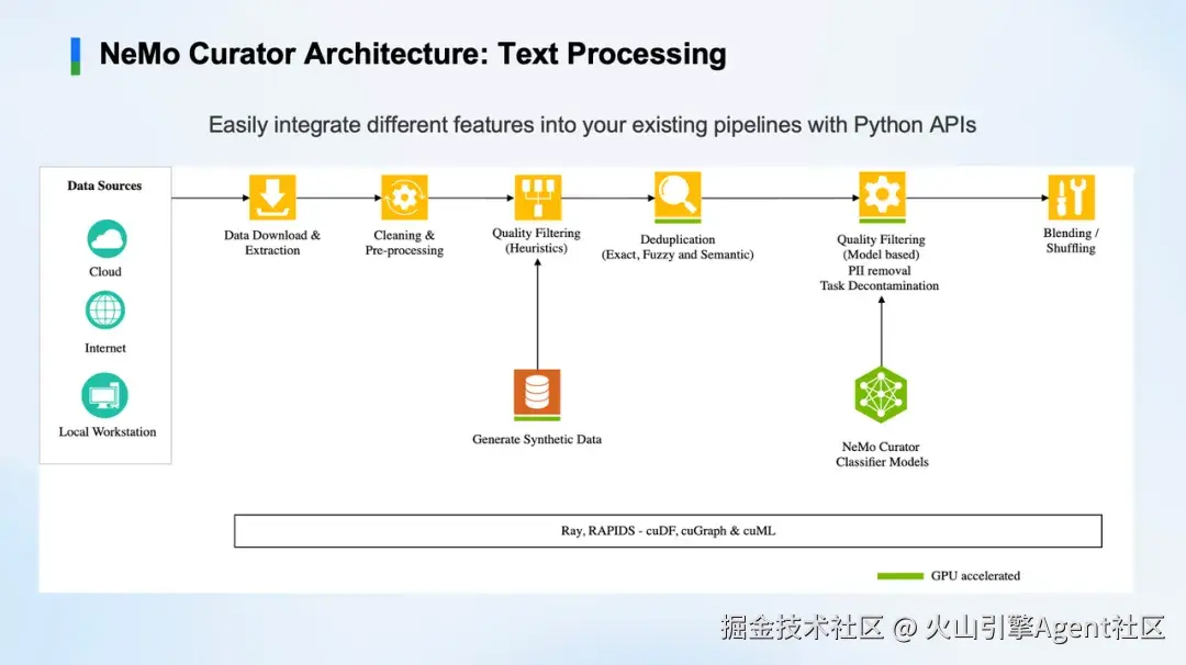 图中是 NeMo Curator 的文本数据处理工作流,可以对在本地和云端的数据,进行数据的导入、清洗、加工以及根据数据质量进行分类、数据去重,进行高质量数据集筛选,完成数据处理工作。