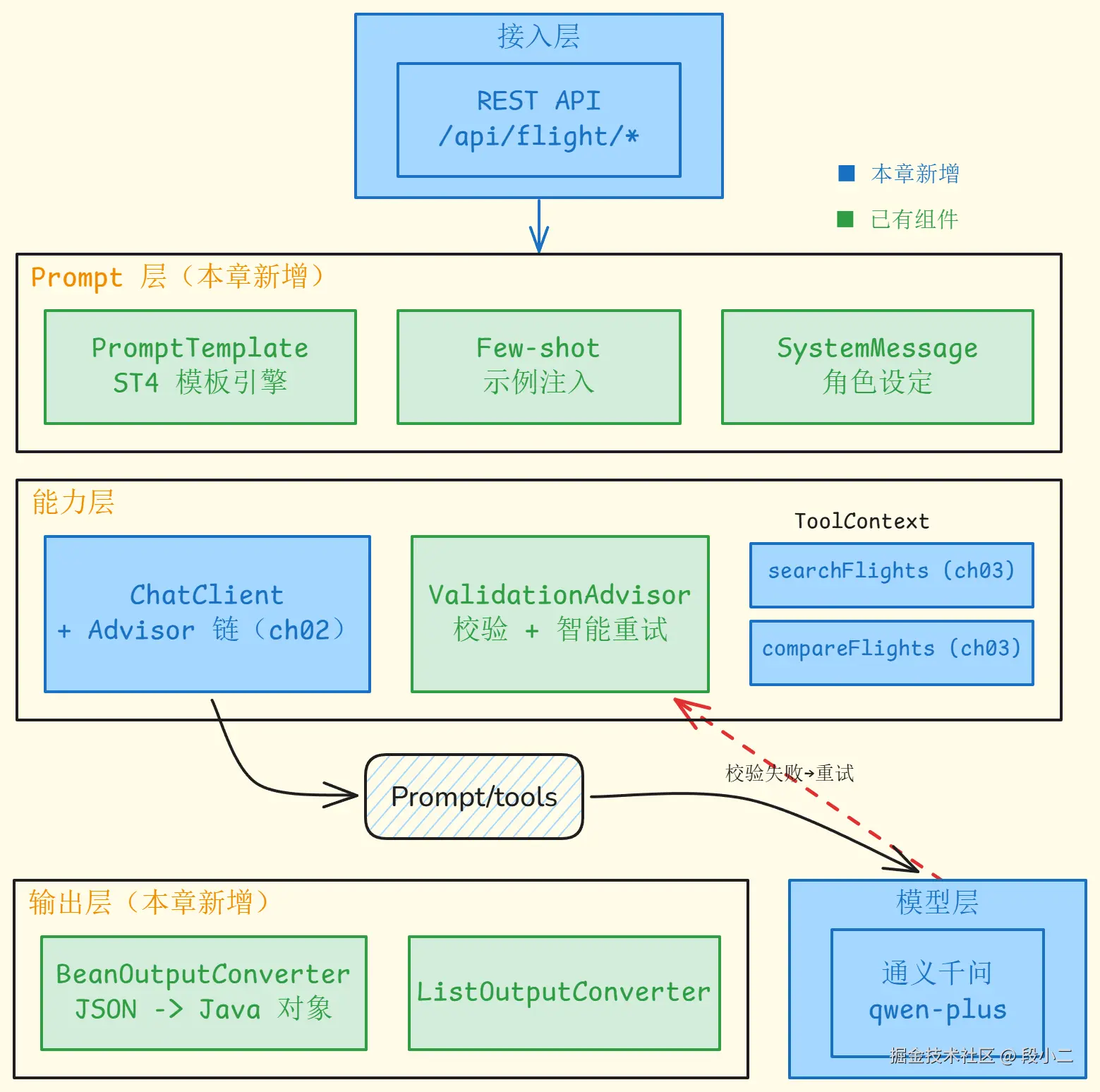 对比上一章,本章新增了 Prompt 模板层 (PromptTemplate + ST4)和 结构化输出层(BeanOutputConverter + ValidationAdvisor):