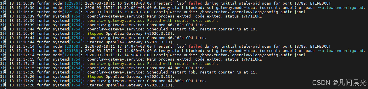 日志显示 gateway 启动被阻止,原因是 "Gateway start blocked: set gateway.mode=local (current: unset) or pass --allow-unconfigured."。这意味着配置文件中的 gateway.mode 没有设置,导致启动被阻止。这与我们之前的分析一致,服务虽然 systemd 启动,但进程初始化失败退出(status 1),然后 systemd 不断重启(restart counter 增加)。日志中还提到 lsof failed,但这是次要的,核心是 mode 未设置