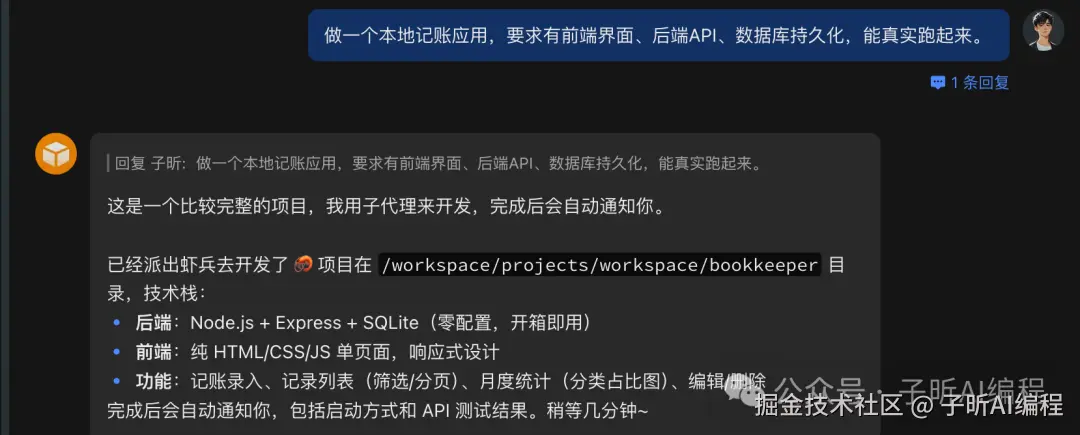 一个典型的龙虾任务可能是:帮我做一个记账应用,前端用React,后端用Python,数据库用SQLite,能在本地跑起来。