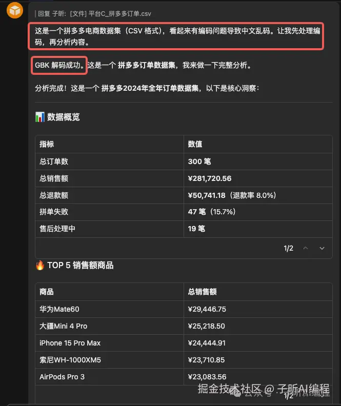 清洗数据时发现异常订单:有退款金额超过原订单金额的情况。它主动标记了这些异常,没有直接删掉或忽略。