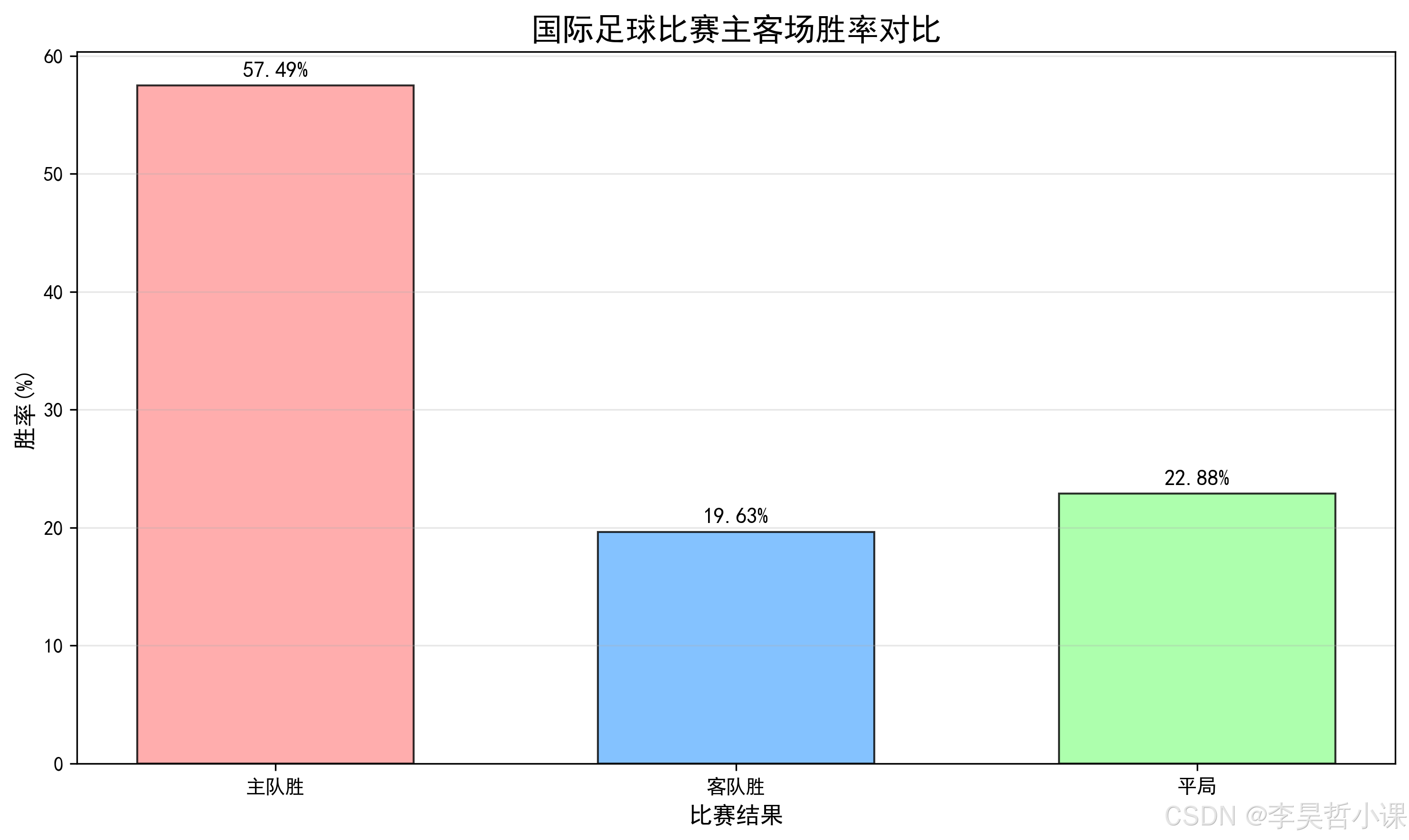 - 主场胜率(57.49%)显著高于客场胜率(19.63%)