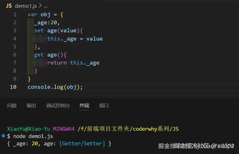 console.log(obj); // { _age: 20, name: '小吴' } 注意:age 不可枚举
