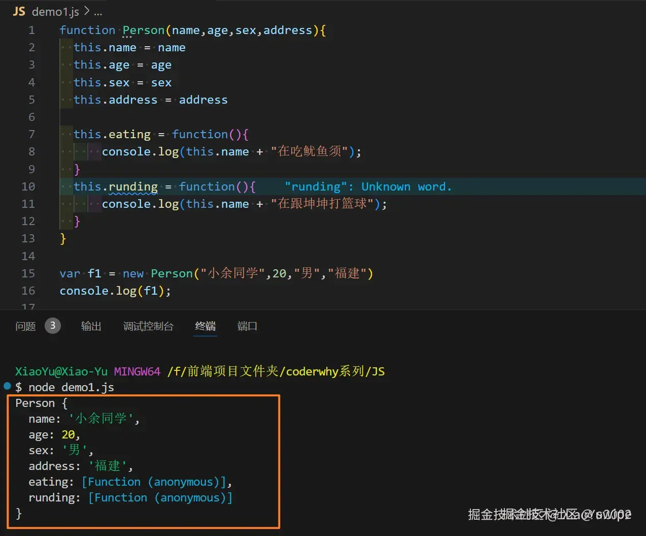 var f1 = new XiaoWu("小吴同学", 20, "男", "福建");