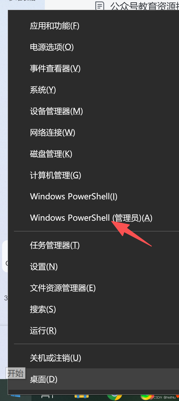 右键点击 Windows 图标,选择"Windows PowerShell(管理员)"