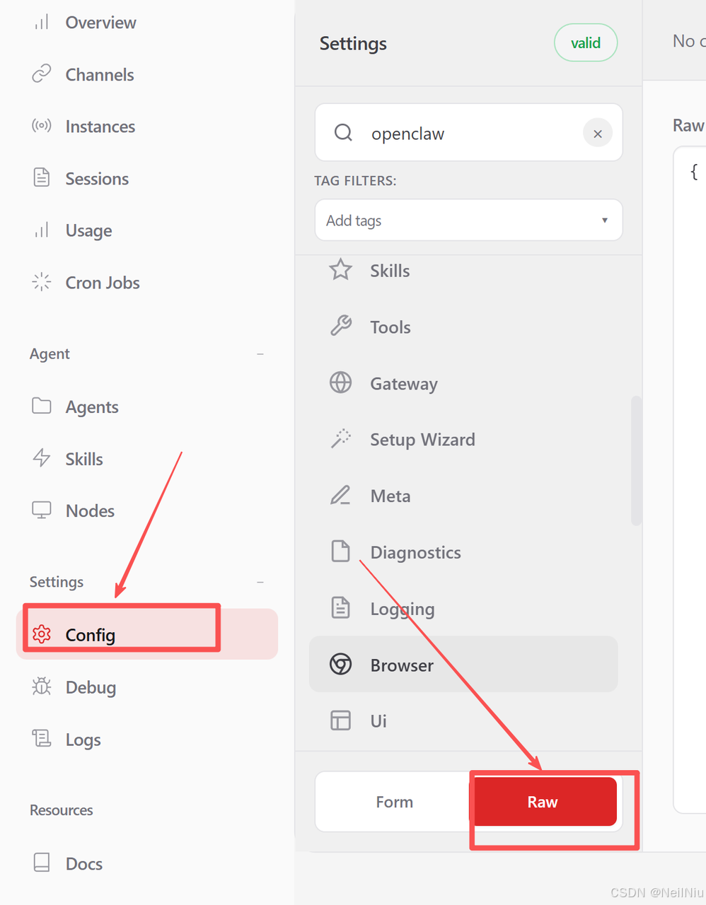 然后在Web UI的左侧菜单栏中选择Config > Raw。