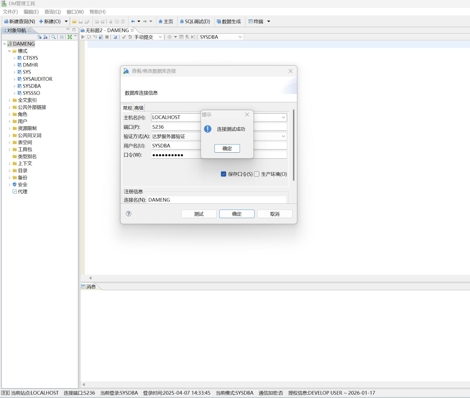 - 点击【测试连接】,提示 "连接成功",点击【确定】完成登录,即可看到数据库实例、表空间、示例库等内容,代表安装完全成功。
