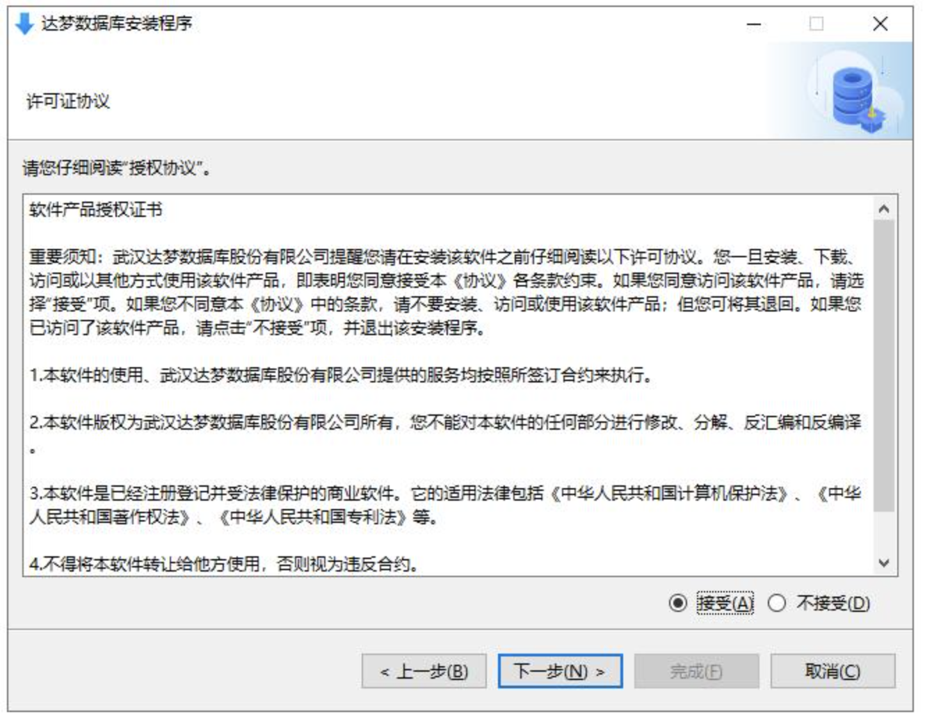 许可证协议:选择【接受】,点击【下一步】。