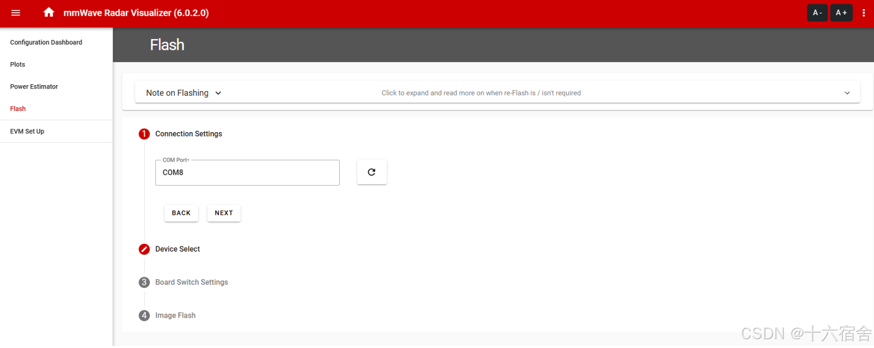 下一步我们将在可视化工具中打开"Flash"选项卡,并选择评估板的COM端口(系统应能自动识别该端口)。
