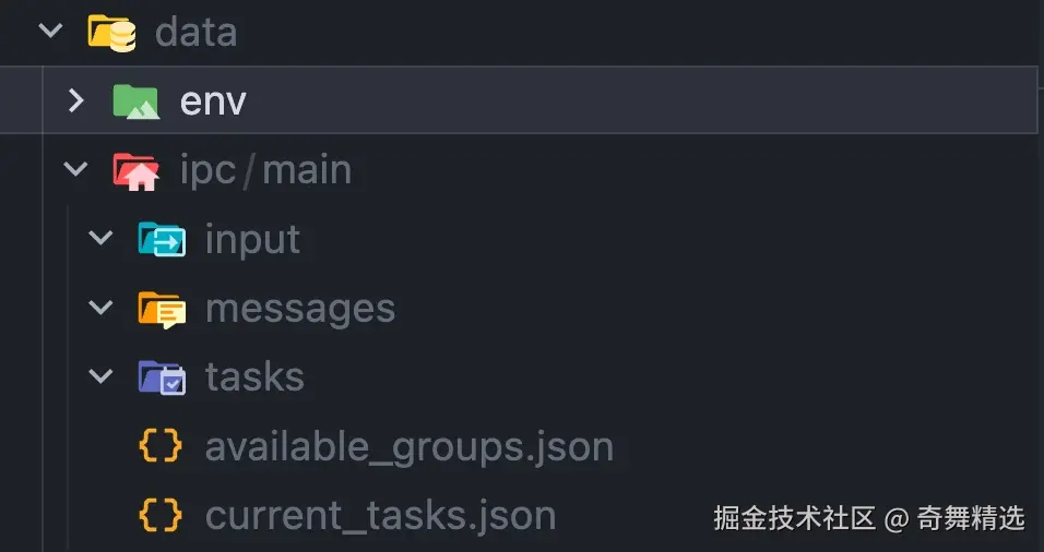 └── tasks/ ← 容器写入,宿主读取(任务管理请求)