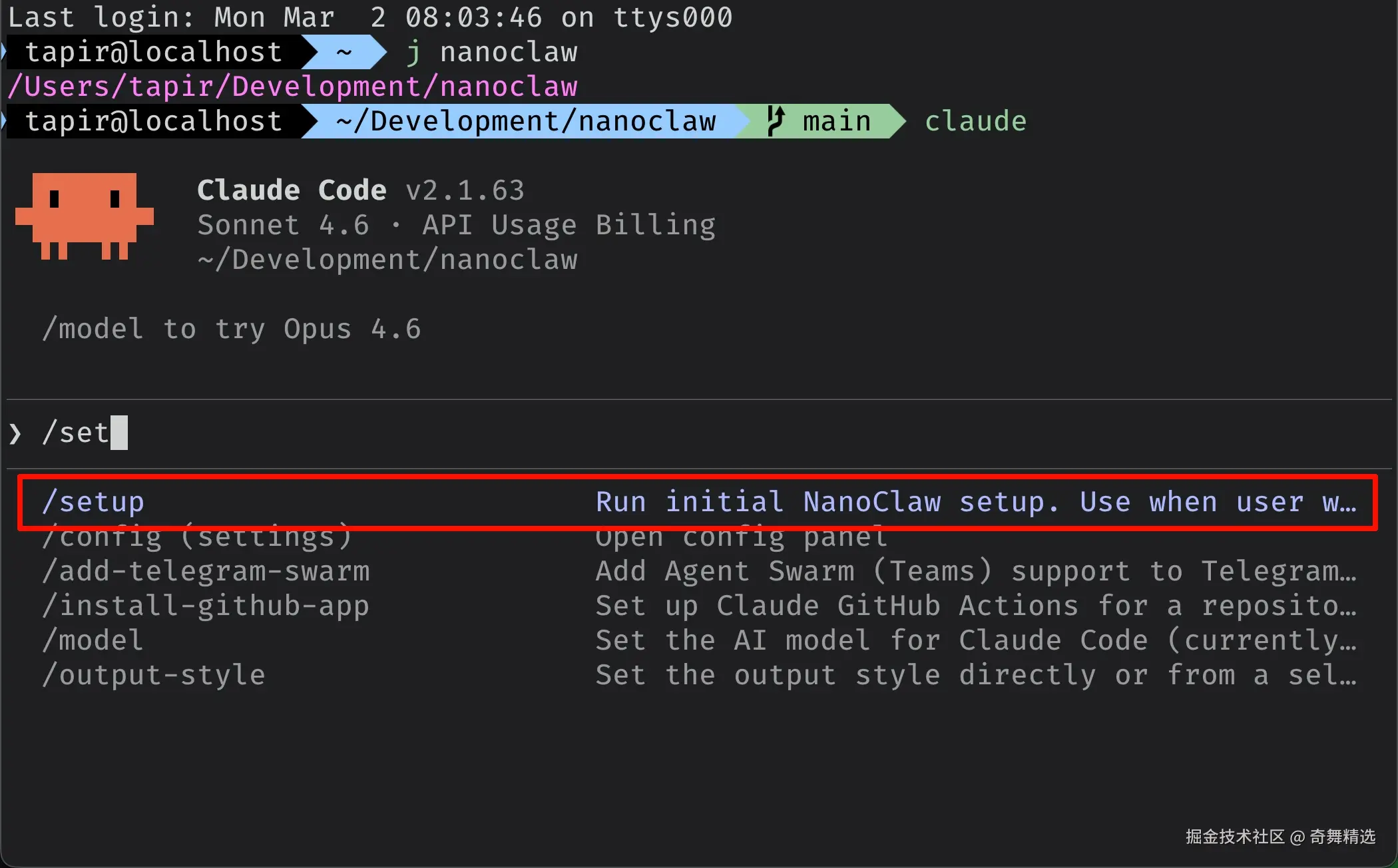 然后我们再对比一下 NanoClaw,官方告诉我们 setup 只需要: