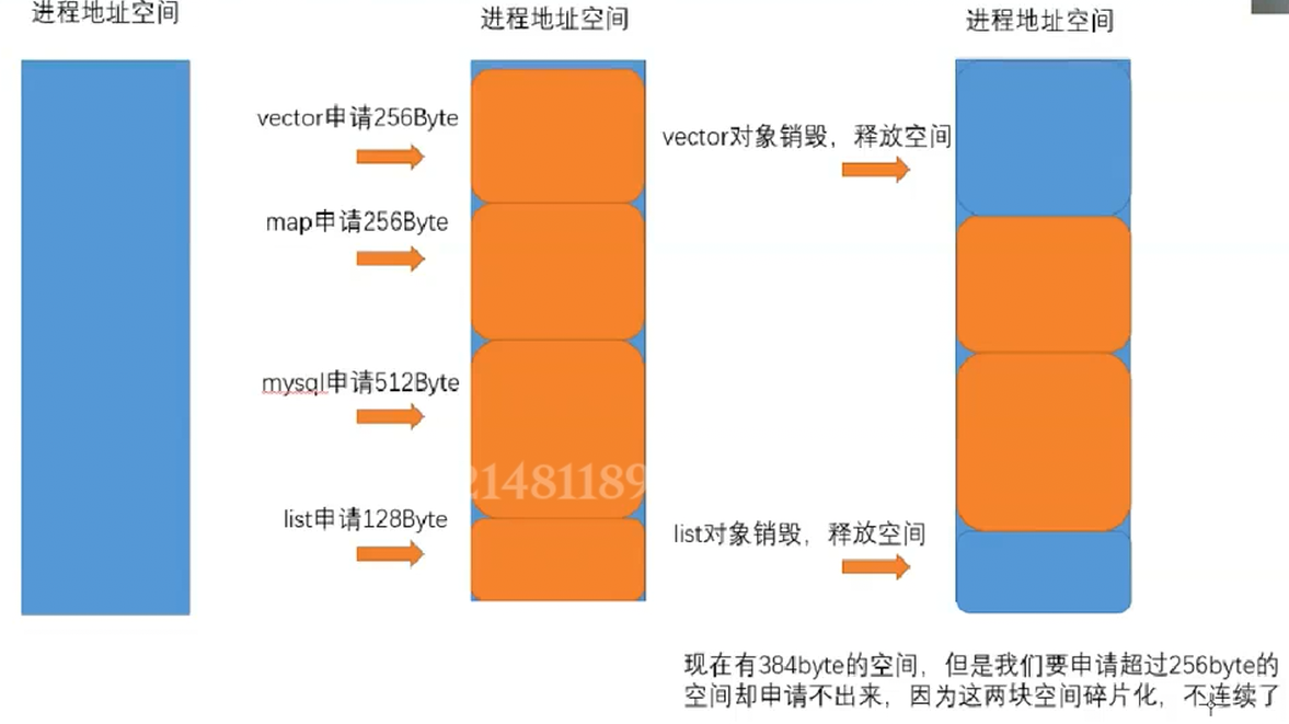 - 频繁分配/释放不同大小内存,会产生大量无法利用的小内存块(内存碎片);