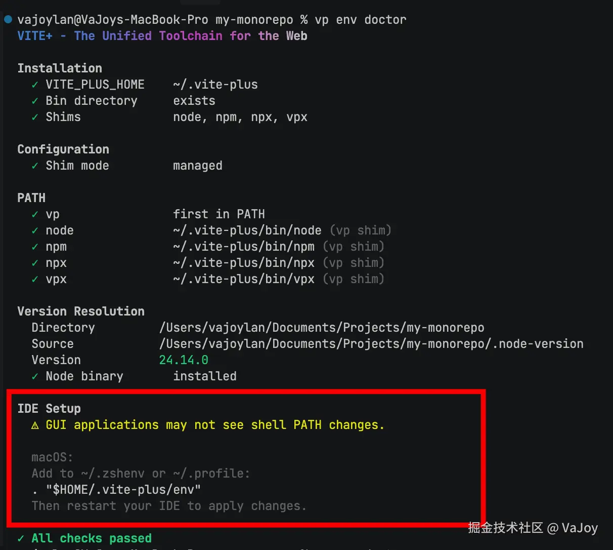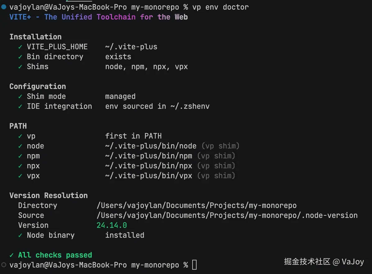 处理后再执行 vp env doctor 会发现该配置问题已被解决: