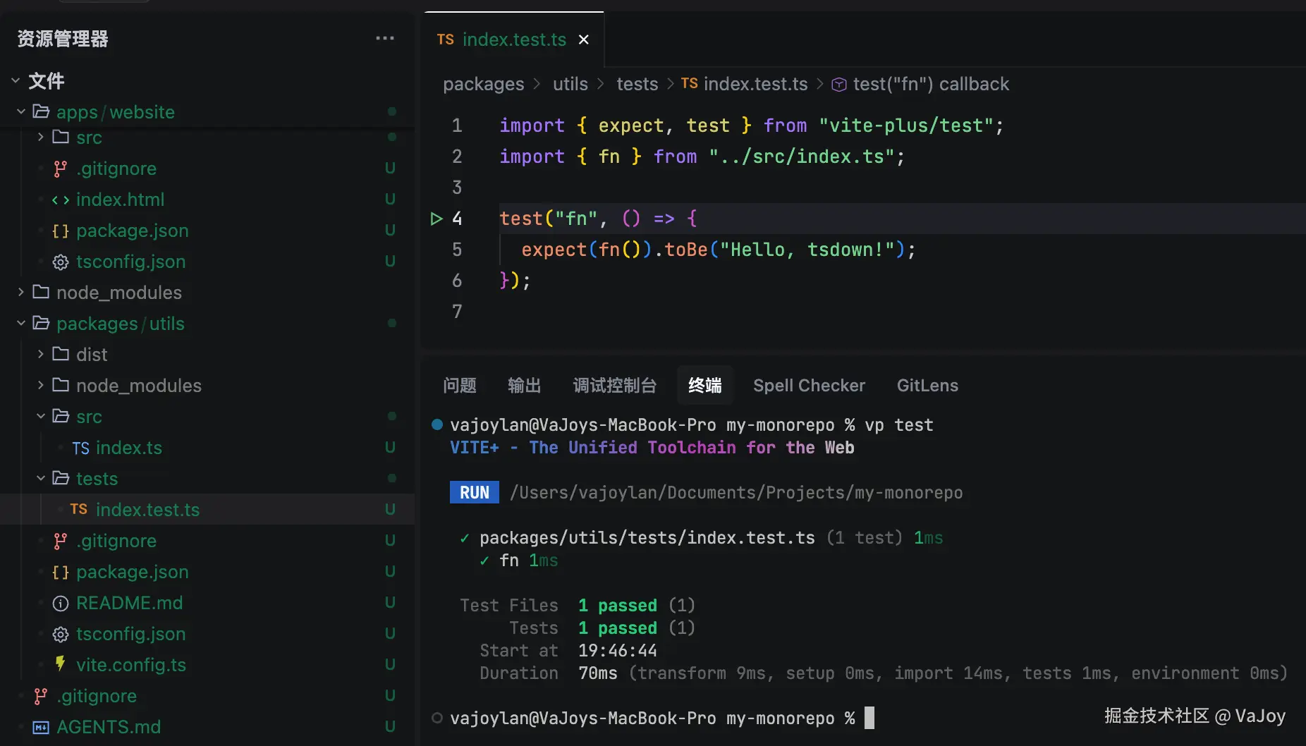 Vitest 是一款兼容 Jest 的高性能测试框架,而 vp test 是执行 vitest run 的语法糖,它会通过正则(**/*.{test,spec}.?(c|m)[jt]s?(x))自行匹配项目中的测试文件,执行并打印出测试结果: