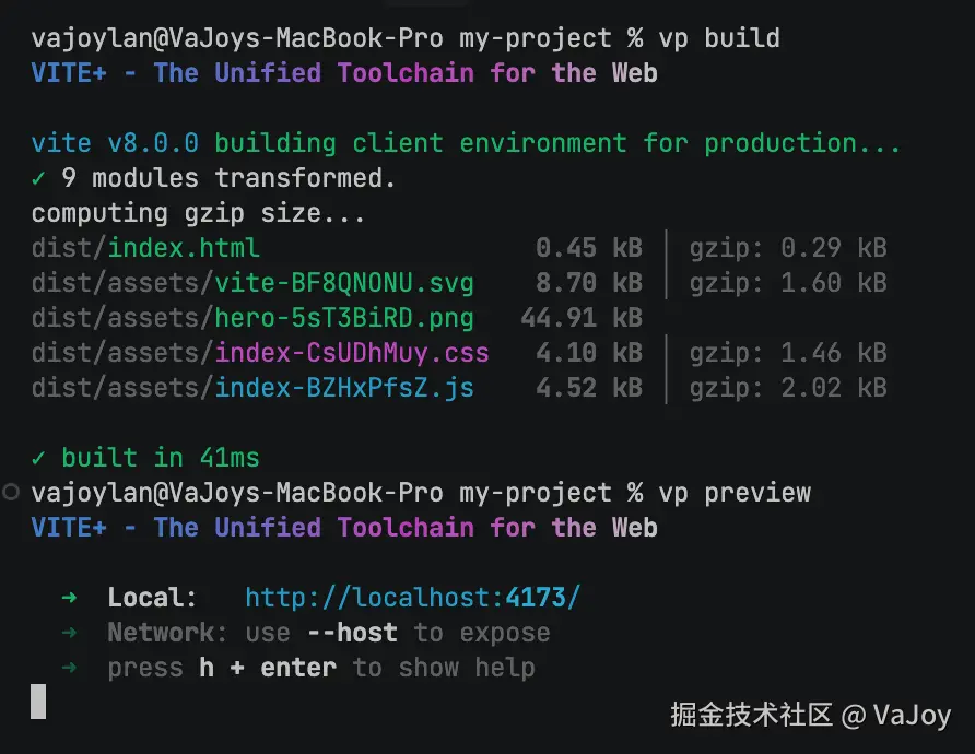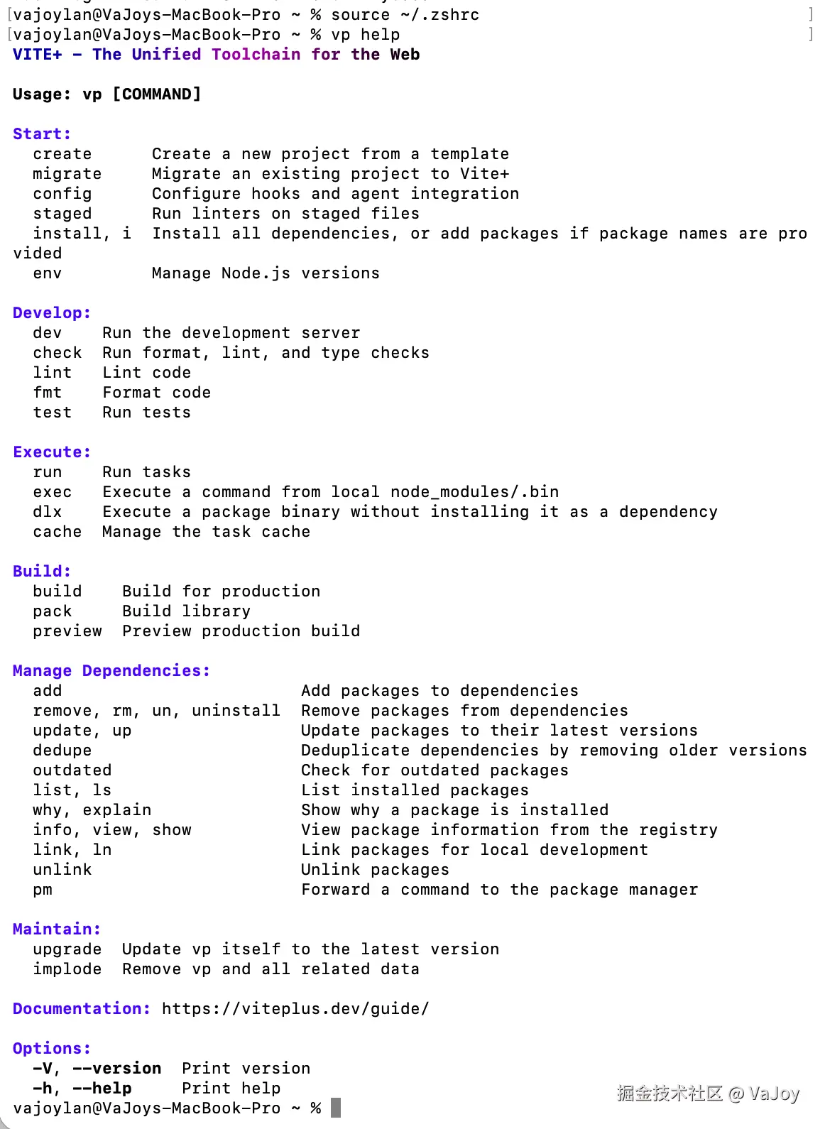 若安装成功,你的系统会新增一个全局的 CLI vp,执行 vp help 会打印出 vp 可用指令列表: