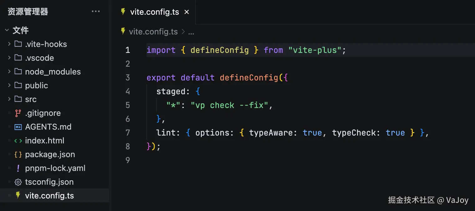 我们在前文有提到,通过 Vite Plus 创建的项目不再需要 vitest.config.ts、.eslintrc、.oxlintrc.json、.prettierrc 等配置文件,而是统一在 vite.config.ts 文件中维护所有工具的配置,这种化繁为简的能力是 Vite Plus 的一大优势。