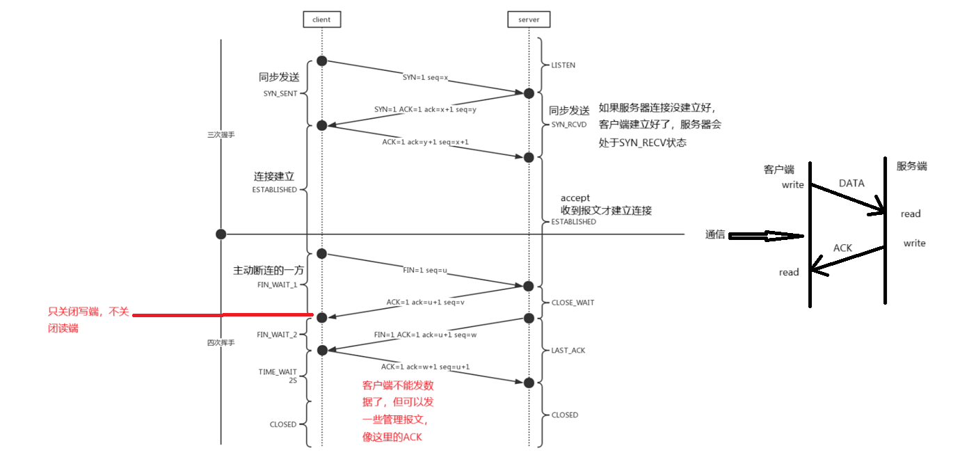 当客户端发送FIN报头(调用close)的时候,服务器会接收到,然后变为CLOSE_WAIT状态,客户端变为FIN_WAIT2状态,接下来向服务器发送2号信号,服务器在底层会自动完成剩下两次挥手,客户端就变为TIME_WAIT状态,如果反过来,服务器变为TIME_WAIT状态,IP和端口依旧被使用中,所以有时候我们关闭服务器后立刻重启,并且使用相同的端口,就会绑定失败,我们可以用setsockopt来设置套接字属性,让套接字可以复用端口,如果服务器还在正常使用,那么会重启失败,如果发现服务器是处于TIME_WAIT状态,就让服务器立即启动,客户端没有这个烦恼,因为客户端绑定的是随机端口号。