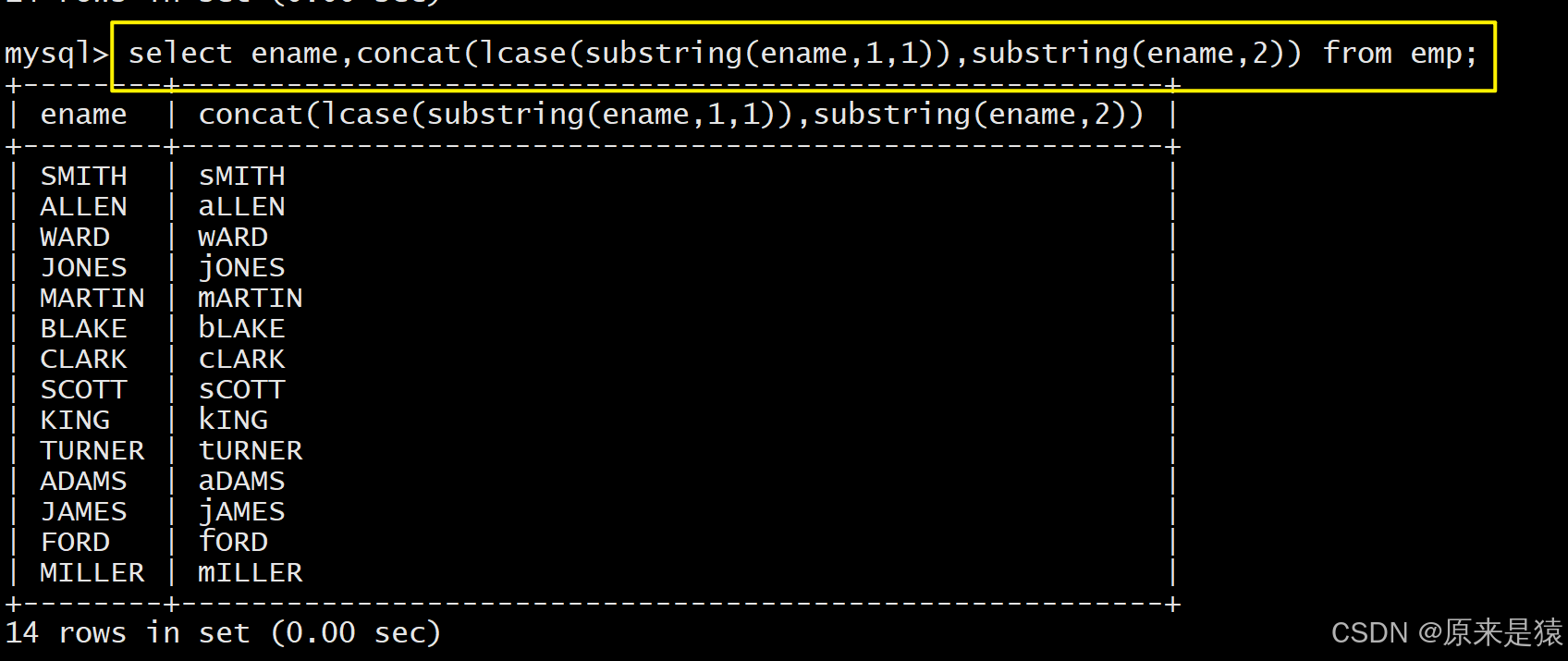 select concat(lcase(substring(ename, 1, 1)),substring(ename,2)) as 新姓名 from EMP;