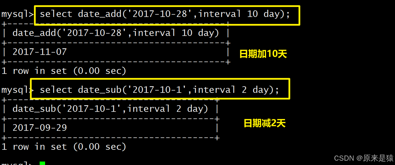 select date_add('2017-10-28', interval 10 day); -- 结果:2017-11-07