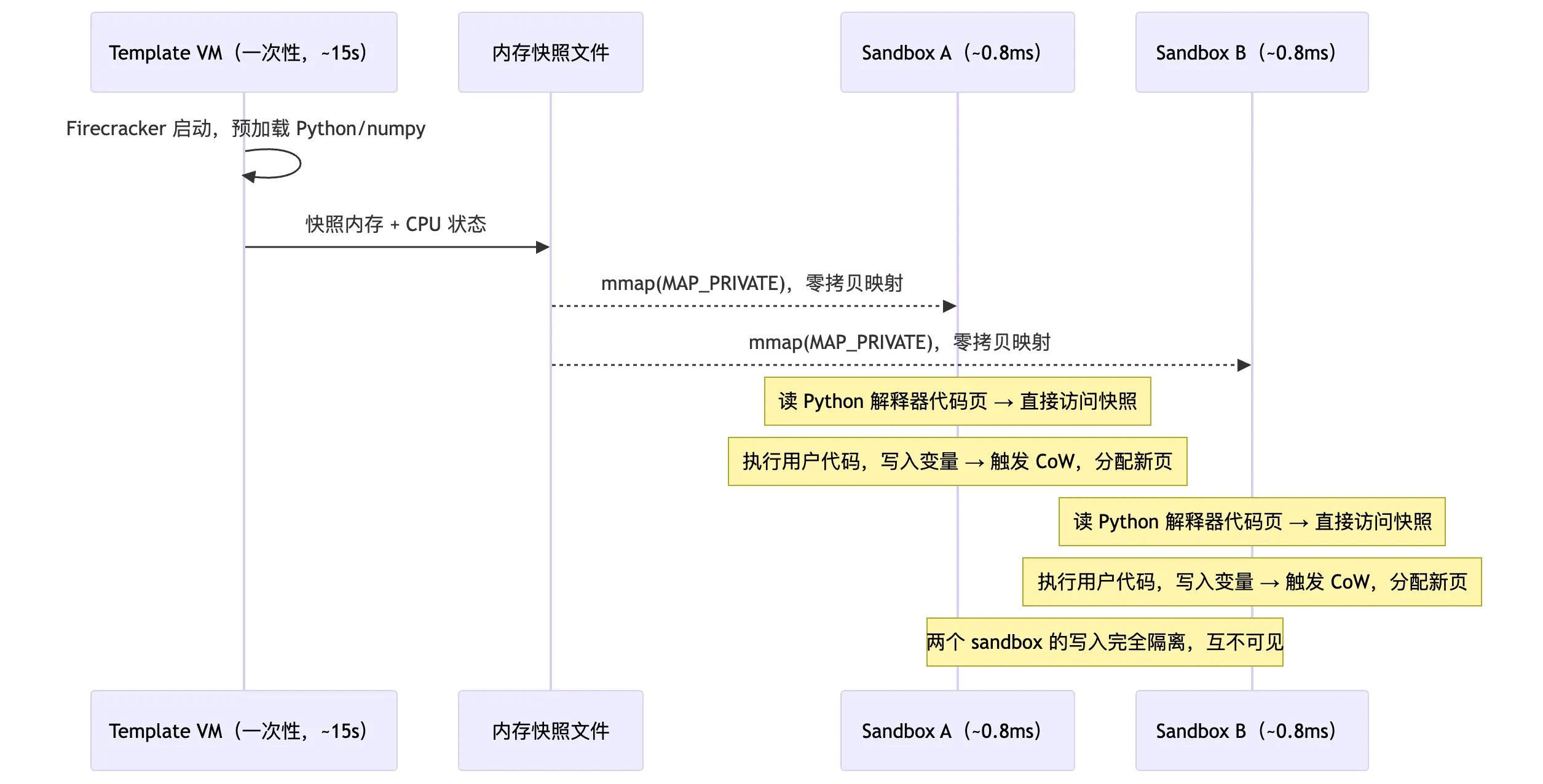ZeroBoot 的洞察是:这次复制大部分是多余的 。Python 解释器、numpy 代码段、标准库------这些在所有 sandbox 之间完全相同。ZeroBoot 用 mmap(MAP_PRIVATE) 解决:读操作直接访问原始快照页(零拷贝),写操作才触发 CoW 分配新页。结果是 sandbox 启动时几乎不需要任何内存复制。