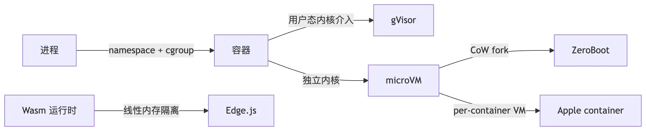 | Wasm(Edge.js) | Wasm 线性内存模型 | 毫秒级 | 极低 | JS/Node Agent |