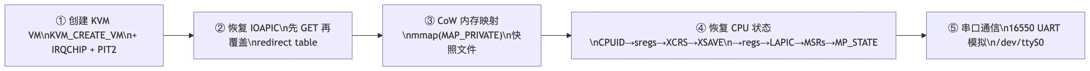 第④步的顺序严格不可乱------XSAVE(扩展处理器状态,含浮点/SIMD 寄存器)必须在基础寄存器之前恢复,否则状态会被覆盖;最后的 MP_STATE 必须设为 RUNNABLE,否则 vCPU 会卡在 HLT 状态,VM 无法启动。