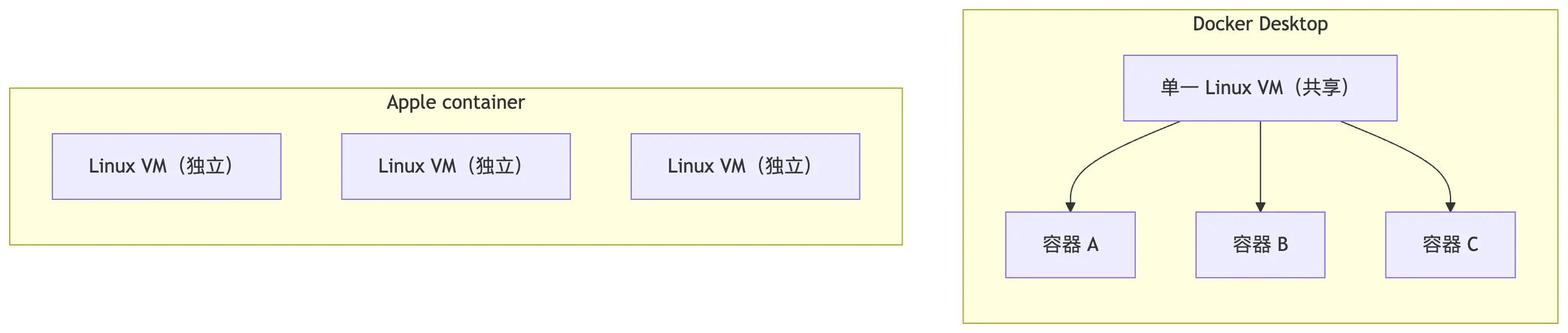 20 个容器在 Docker Desktop 里是 1 个 VM + 20 个进程;在 Apple container 里是 20 个独立 VM。隔离粒度从容器级提升到了 VM 级。