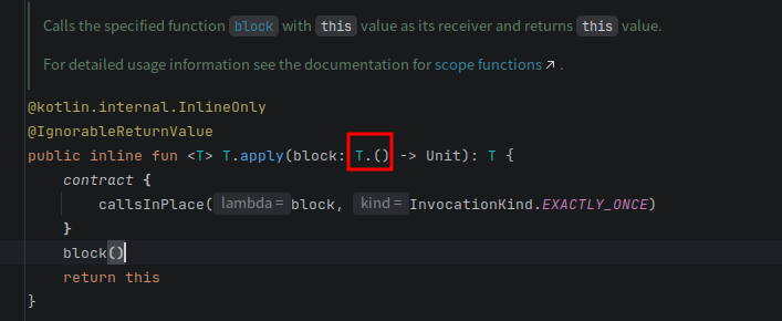 从反编译的代码可以看出,T.() -> Unit对应的Function1类。T.()就是Function1.invoke()的入参。所以kotlin也把T.()中的T称为Receiver。
