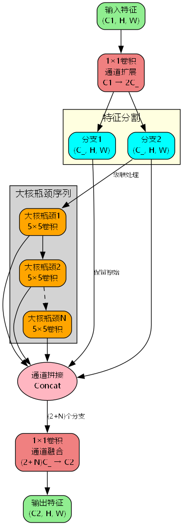 设输入 X ∈ R C 1 × H × W \mathbf{X} \in \mathbb{R}^{C_1 \times H \times W} X∈RC1×H×W,C3k2大核瓶颈的处理流程为: