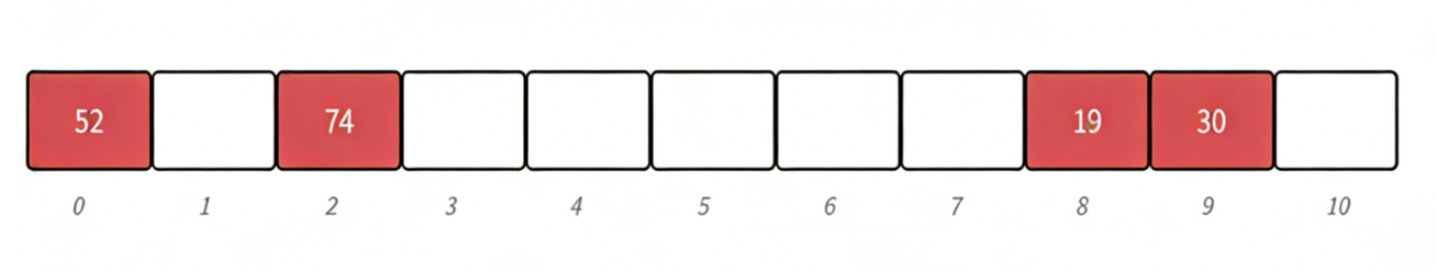 假设哈希表大小 M = 11,我们要插入:{19, 30, 52, 63, 11, 22}