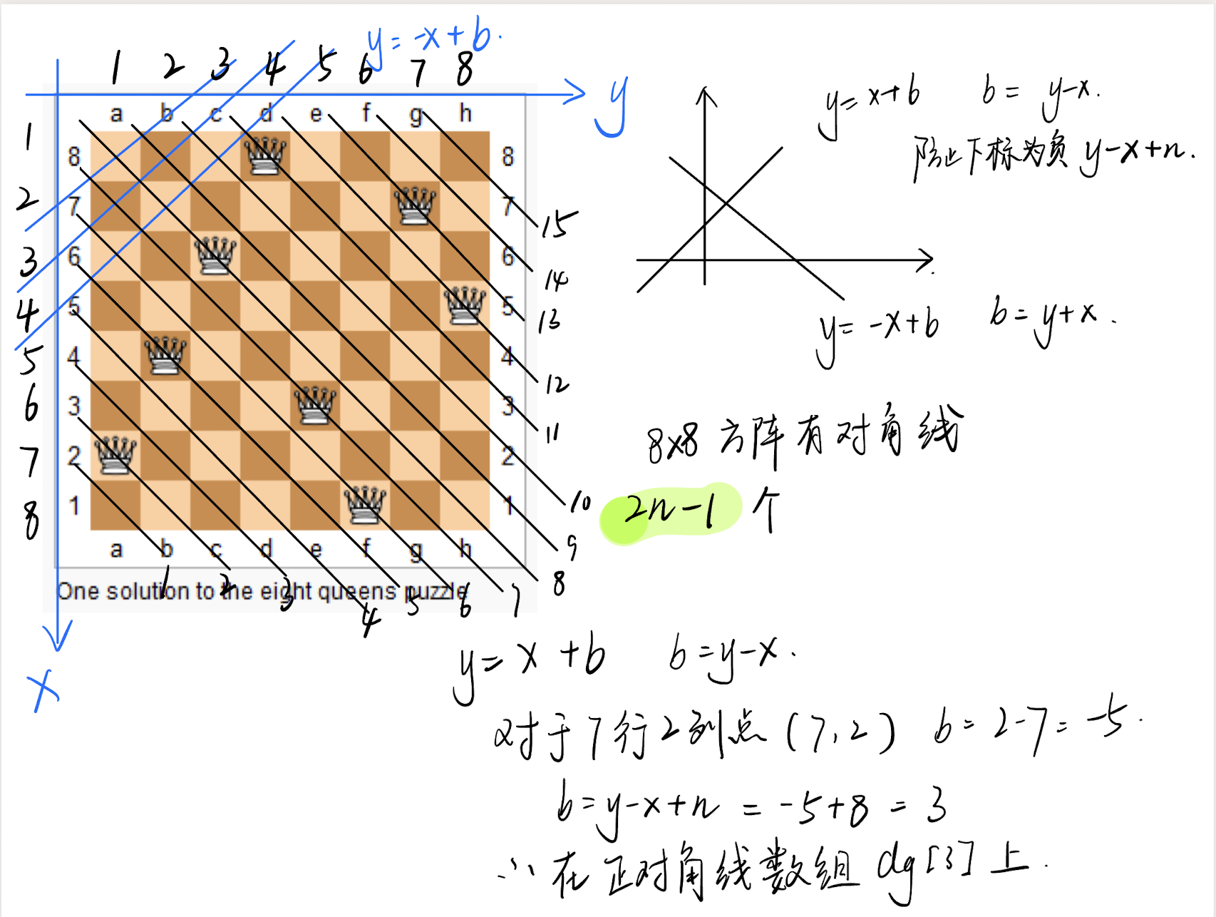 对于对角线坐标的计算,使用y坐标b进行区分,主对角线(黑色)是左上到右下,将棋盘逆时针旋转90度后,对应y = x + b,b = y - x,对于坐标点(1, 7)这样计算就会出现负索引,由于行纵坐标最多相差n-1,所以补上n就可以防止出现负索引,所以b = y - x + n