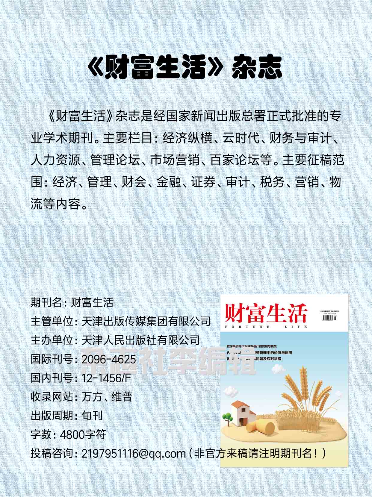 《财富生活》杂志是经国家新闻出版总署正式批准的专业学术期刊。主要栏目:经济纵横、云时代、财务与审计、人力资源、管理论坛、市场营销、百家论坛等。主要征稿范围:经济、管理、财会、金融、证券、审计、税务、营销、物流等内容。