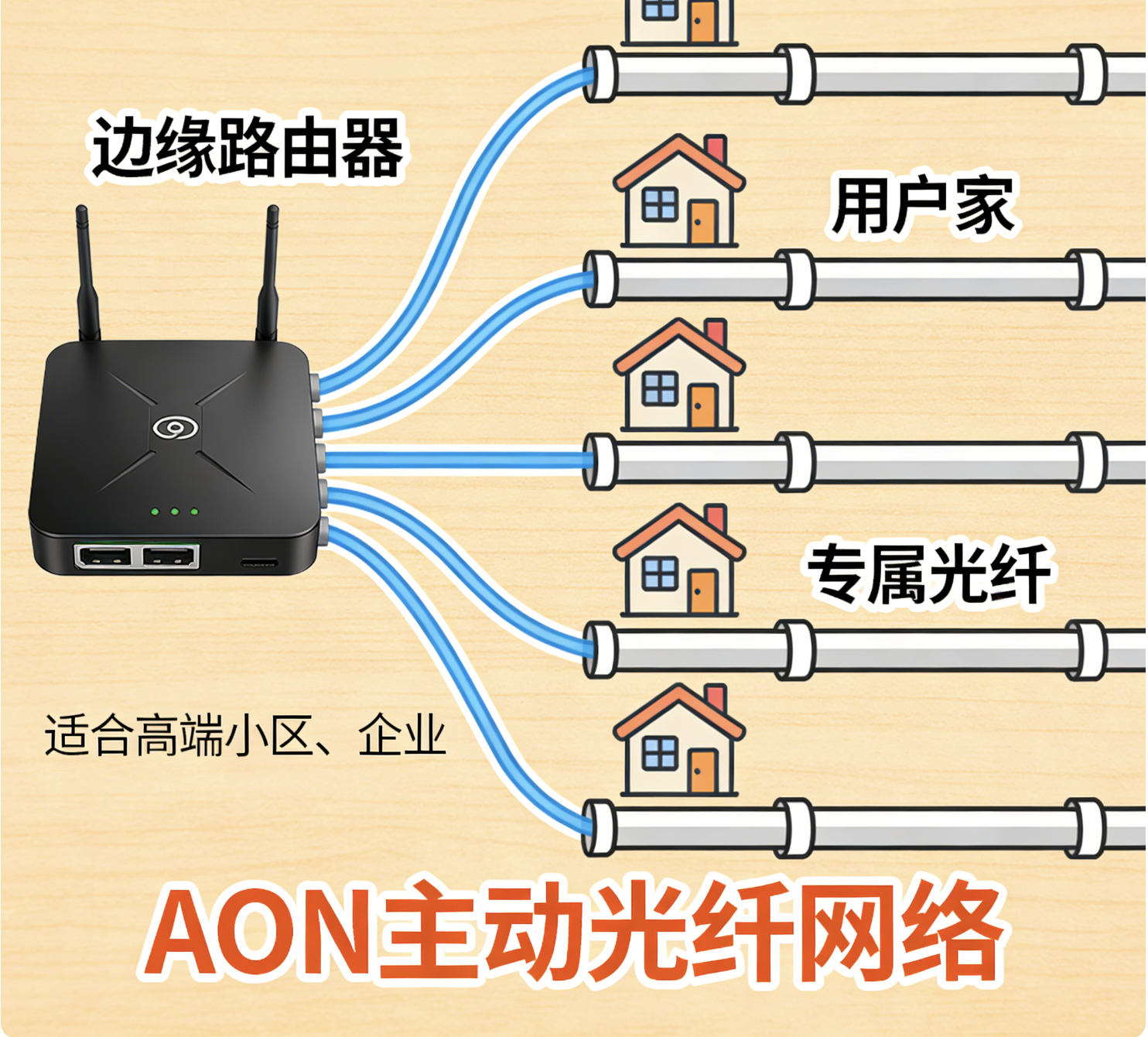 AON(Active Optical Network,主动光纤网络):相当于"给每家每户拉一根独立的光纤",从边缘路由器到你家,是专属的光纤,速度稳定,不受其他家庭影响,但成本高------就像"每家每户有一根独立的水管,互不干扰",适合高端小区、企业。