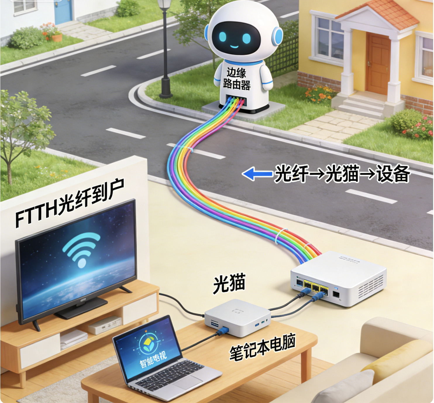 FTTH(Fiber To The Home,光纤到户),就是光纤直接从小区的边缘路由器,拉到你家里,再通过光猫(ONT)连接到你的设备------这是目前速度最快、最稳定的接入方式,我们平时说的"百兆光纤""千兆光纤",基本都是FTTH。