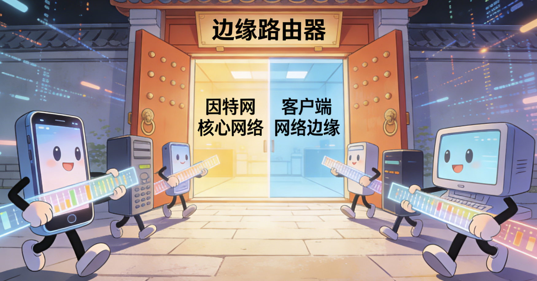 简单说:你家的手机、电脑,不管通过Wi-Fi还是网线,最终都会连接到边缘路由器;边缘路由器再把你的请求,转发到因特网的核心网络,进而连接到数据中心的服务器------就像你去餐馆吃饭,必须先经过大门(边缘路由器),才能进入后厨(数据中心)找厨师(服务器)。