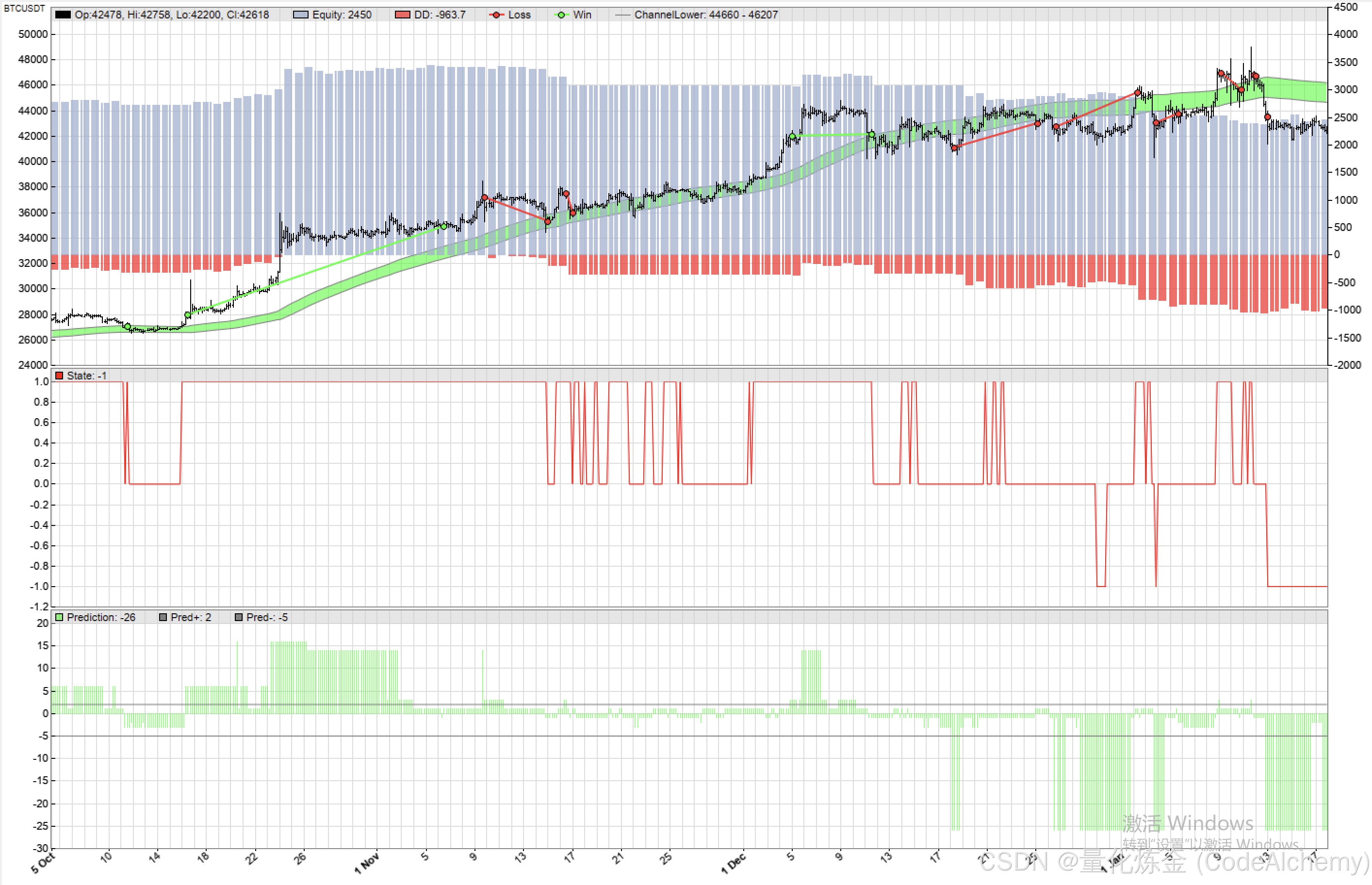 - 当趋势线下降,且收盘价低于通道下轨时,将市场状态标记为 -1(下跌状态)