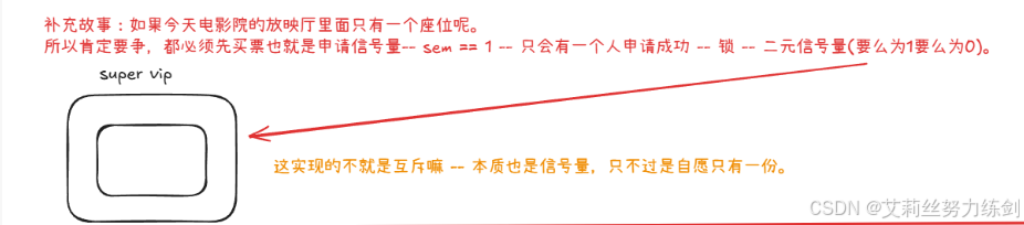 在我们今天来看我们可以把这个放映厅想成内存块。一个个人就是一个个进程。就像我人要买票,每一个进程也需要对应的操作才能访问,也就是先申请信号量,所以我们进入临界区对这个计数器------>P(),走了++,V()。