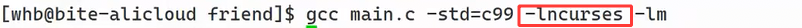 下面我们直接使用 gcc 进行编译链接 : gcc 先把 main.c 编译成目标文件 main.o(机器码片段),再处理 #include <ncurses.h> ,检查函数/类型声明是否正确,链接阶段:把 main.o 和系统 C 标准库(libc.so)、以及你指定的 libncurses.so 合并。