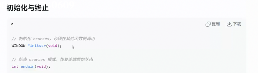 ncurses库不是 C 语言标准库(libc)的一部分,也不是 POSIX 标准强制要求的库。需要手动安装(比如 yum install ncurses-devel)才能使用,系统默认不带开发头文件。本质上和我们自己写的 .so / .a 库一样,都是预编译的二进制代码 + 头文件,供其他程序调用。