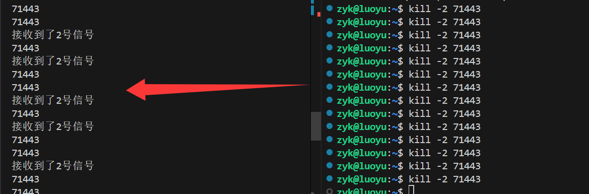 可以发现,现在发送2号信号无法终止进程了,而是进程执行了自定义动作函数!
