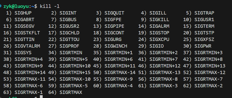 通过指令kill -l,可以查到系统中所有的信号种类: