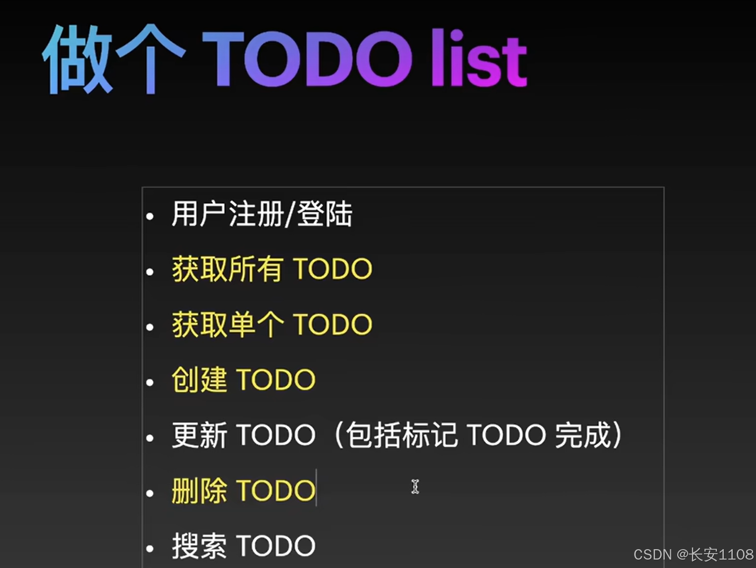 注意点2:对于变量式URL,如todos/{id},要使用特殊的字符标注,本例子中的框架是**:id**,这个冒号