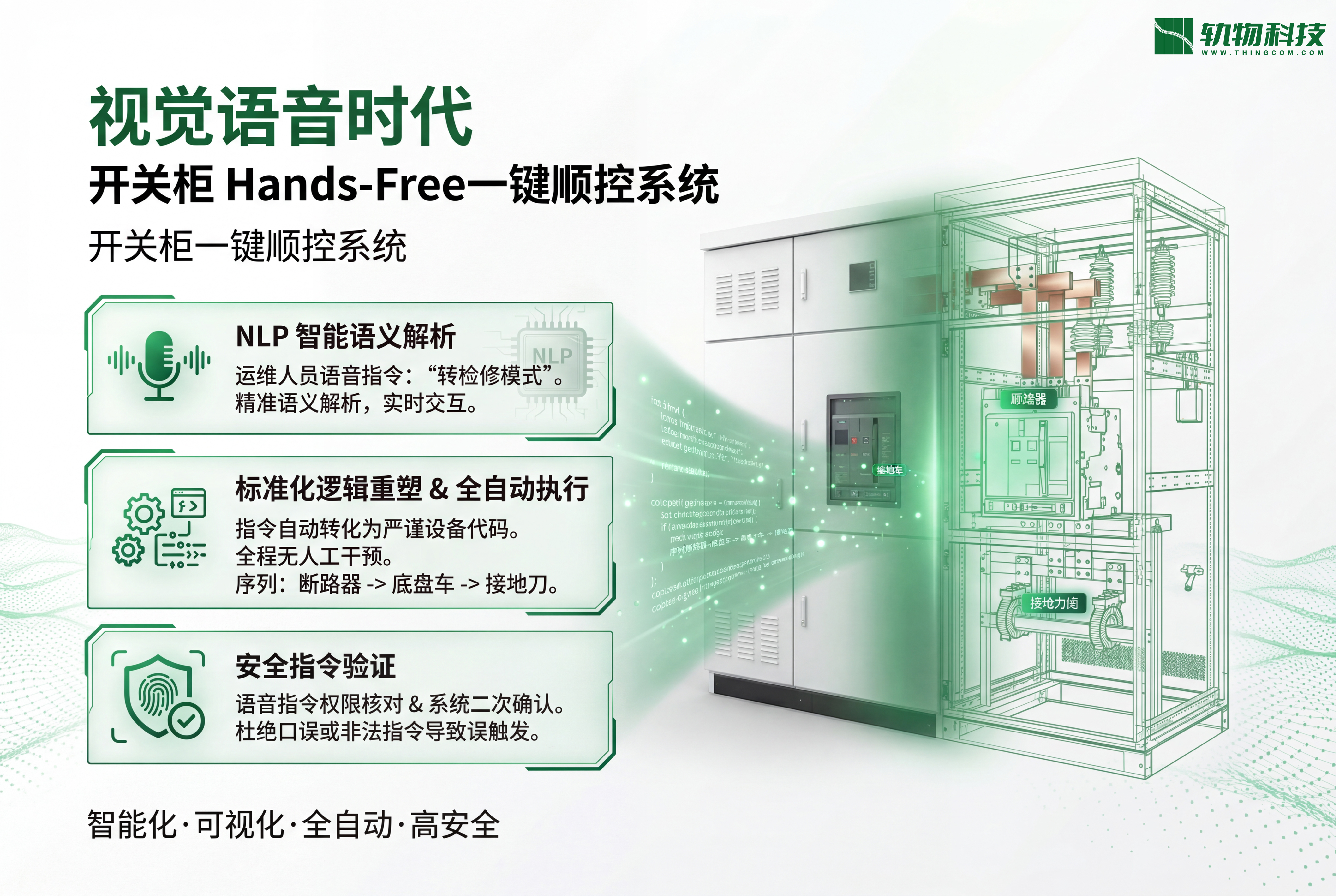 - 标准化逻辑重塑: 当运维人员说出"转检修模式"时,系统会自动将其转化为严谨的代码序列:断开断路器 -> 摇出底盘车 -> 合上接地刀,全程无需人工干预。