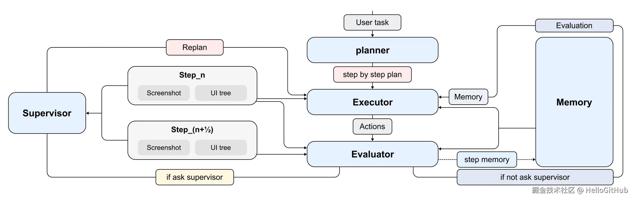 - 监督者:当评估者检测到操作多次失败时,监督者会分析所有屏幕截图、状态和历史并重新规划,防止死循环。