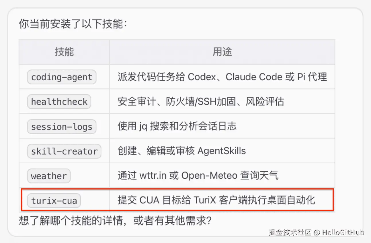 回答中如果包含 turix-cua 技能,就代表 OpenClaw 已成功安装该技能。