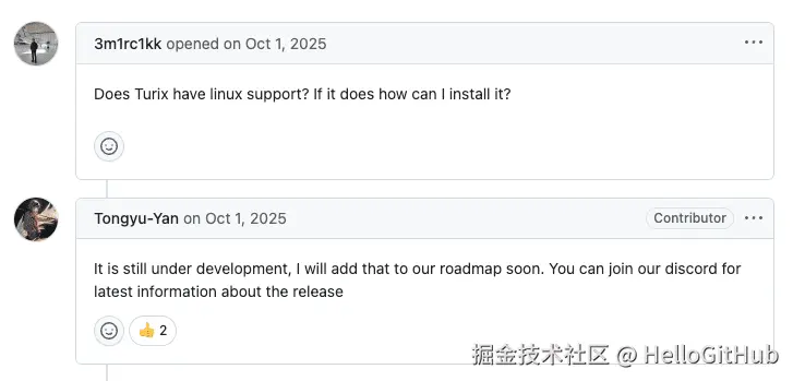 除了 TuriX 在易用性、准确率,以及提升 OpenClaw 操作应用效果上带来的惊喜,在 Issues 和社交媒体上逛了一圈我发现 TuriX 作为一个开源项目,他们的"听劝"(倾听用户的声音)也给我留下了深刻的印象。每一条 Issue 他们都会认真对待并及时回复,你可以去提个 issue 感受下他们的热情~(TuriX 的开发同学不要打我 🤣)