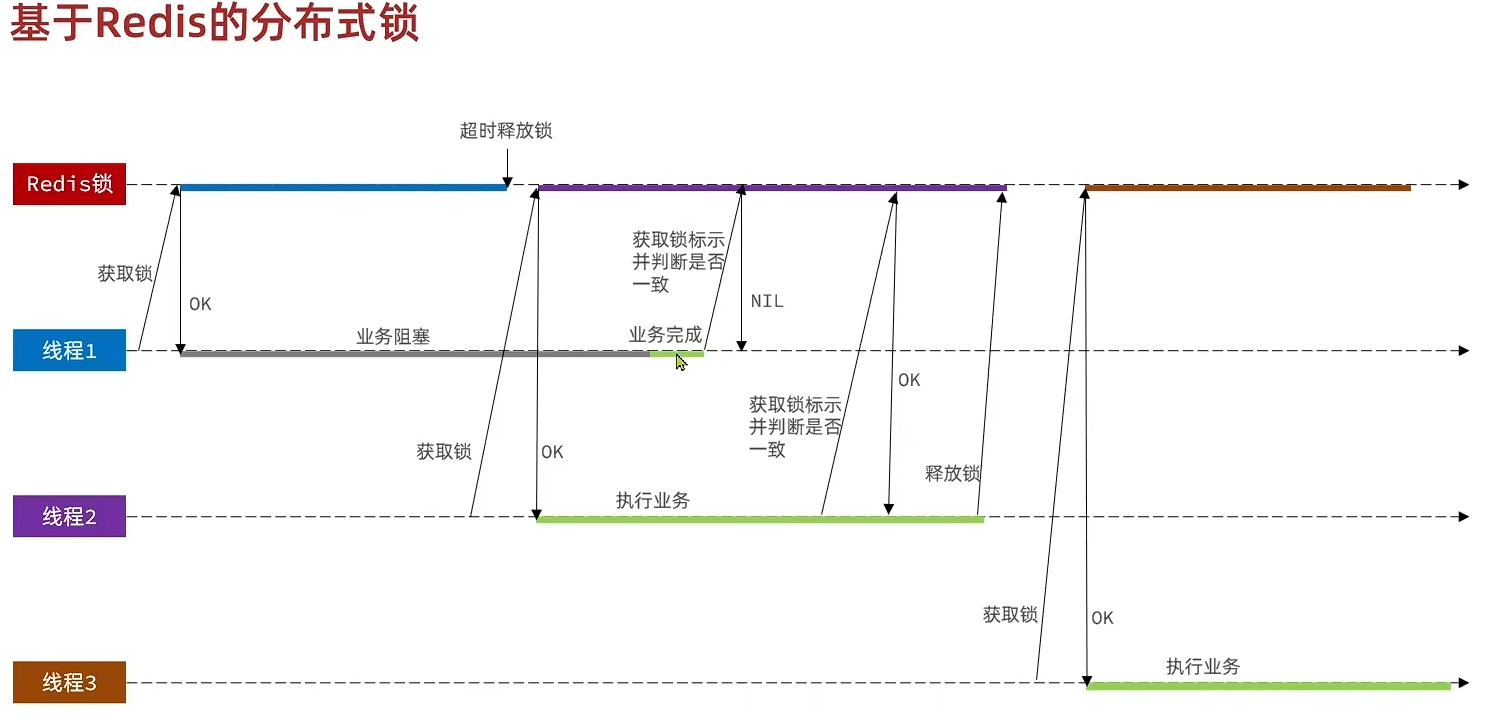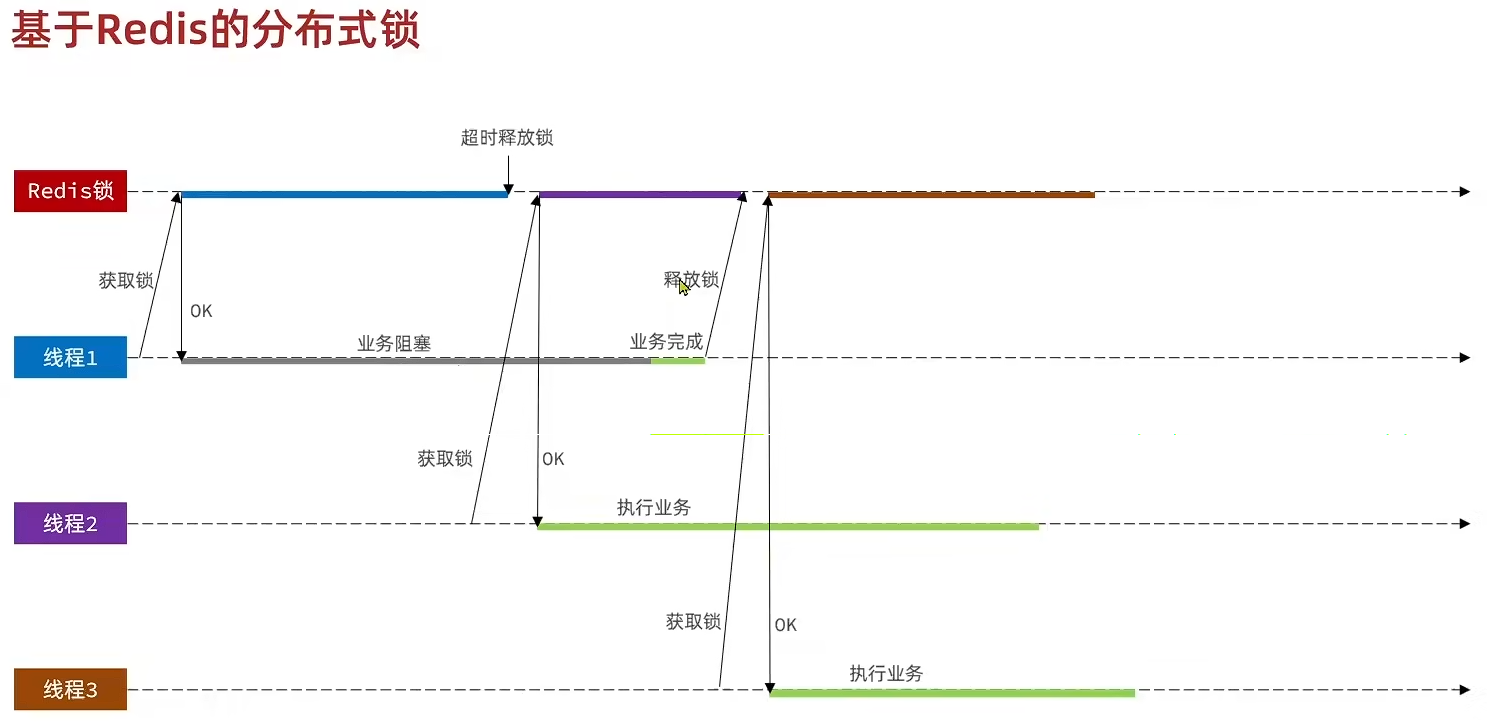 - 极端情况下,持有锁的线程在锁的内部出现了阻塞,导致他的锁自动释放,这时其他线程,线程2来尝试获得锁,就拿到了这把锁,然后线程2在持有锁执行过程中,线程1反应过来,继续执行,而线程1执行过程中,走到了删除锁逻辑,此时就会把本应该属于线程2的锁进行删除,这就是误删别人锁的情况说明