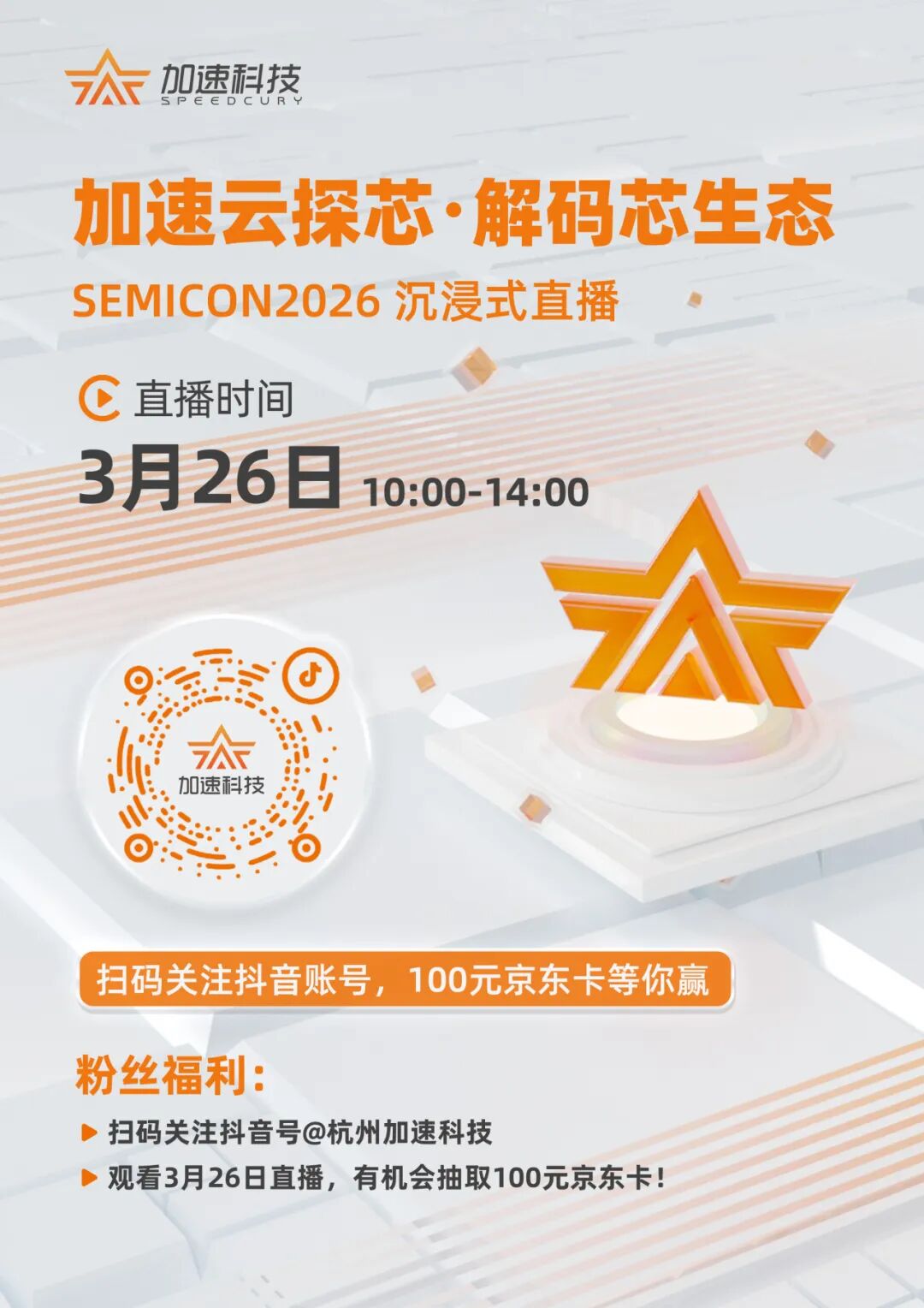 此外,加速科技还将于3月26日进行抖音线上直播,直击T1113展台 盛况 ,同时逛展SEMICON China 2026。直播间将抽奖送出惊喜豪礼,关注加速科技抖音号,参与互动即有机会赢取100元京东卡!